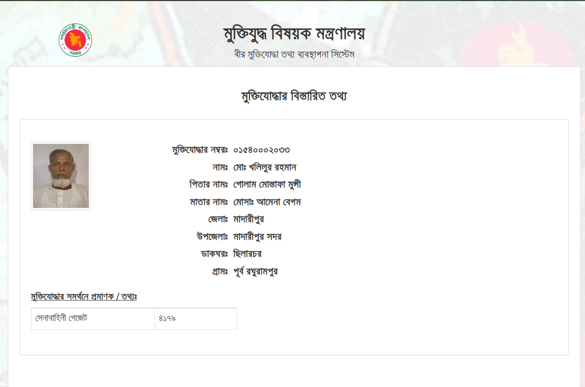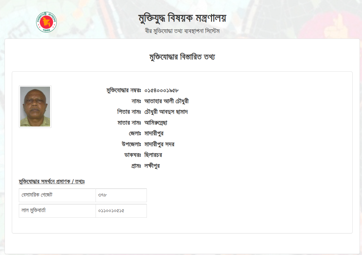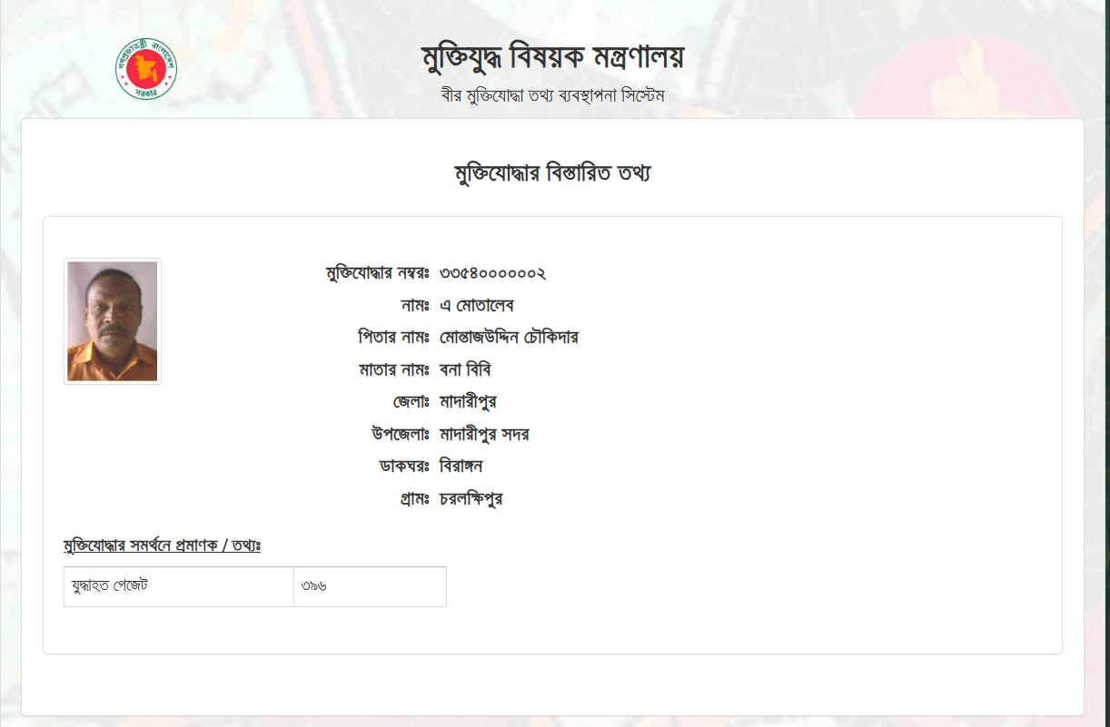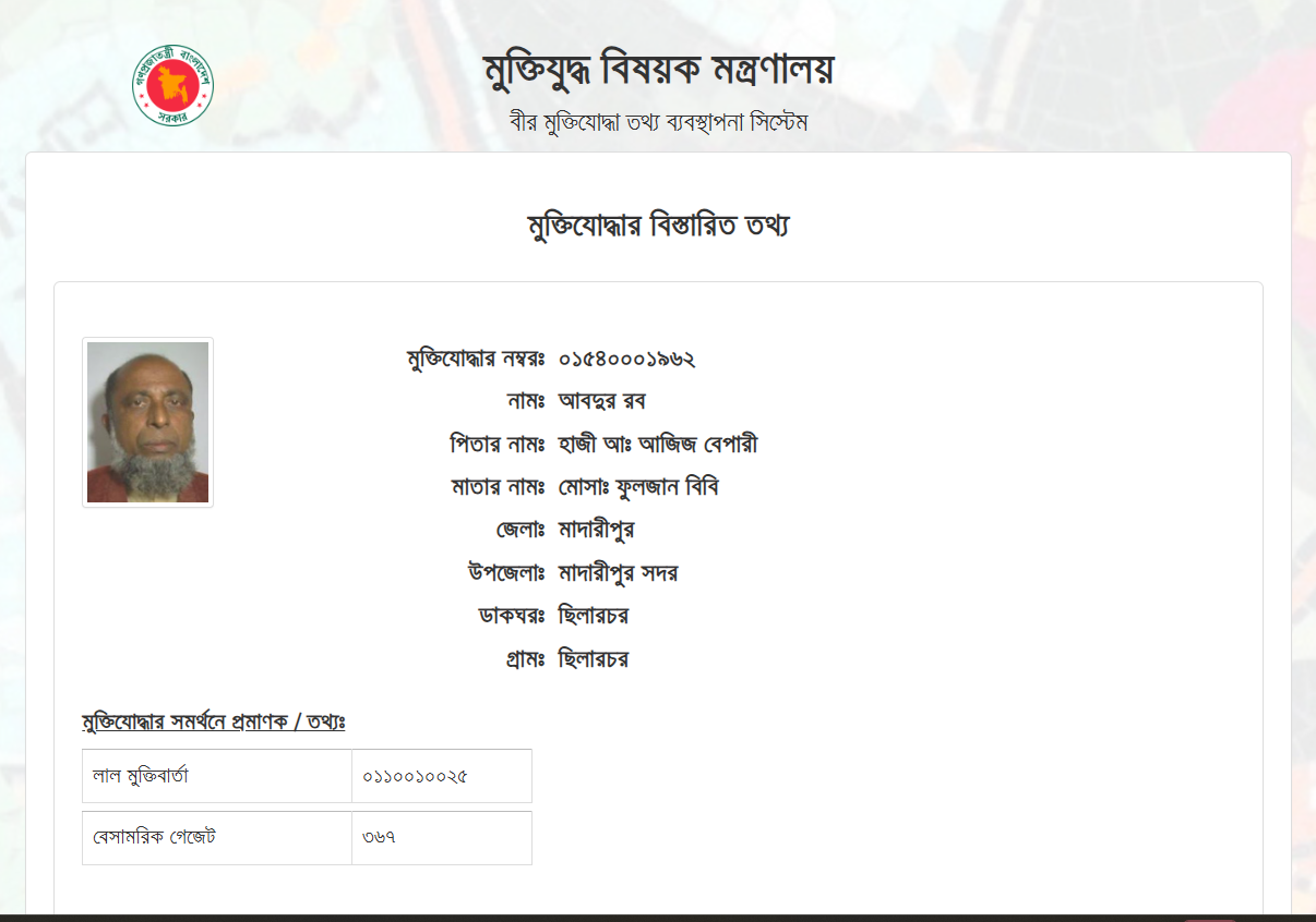 | ৫ | এ মোতালেব | যুদ্ধাহত গেজেট ৩৯৬ | | 0 | ছিলারচর | | | দেখুন |