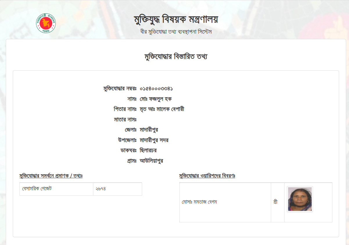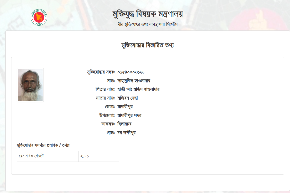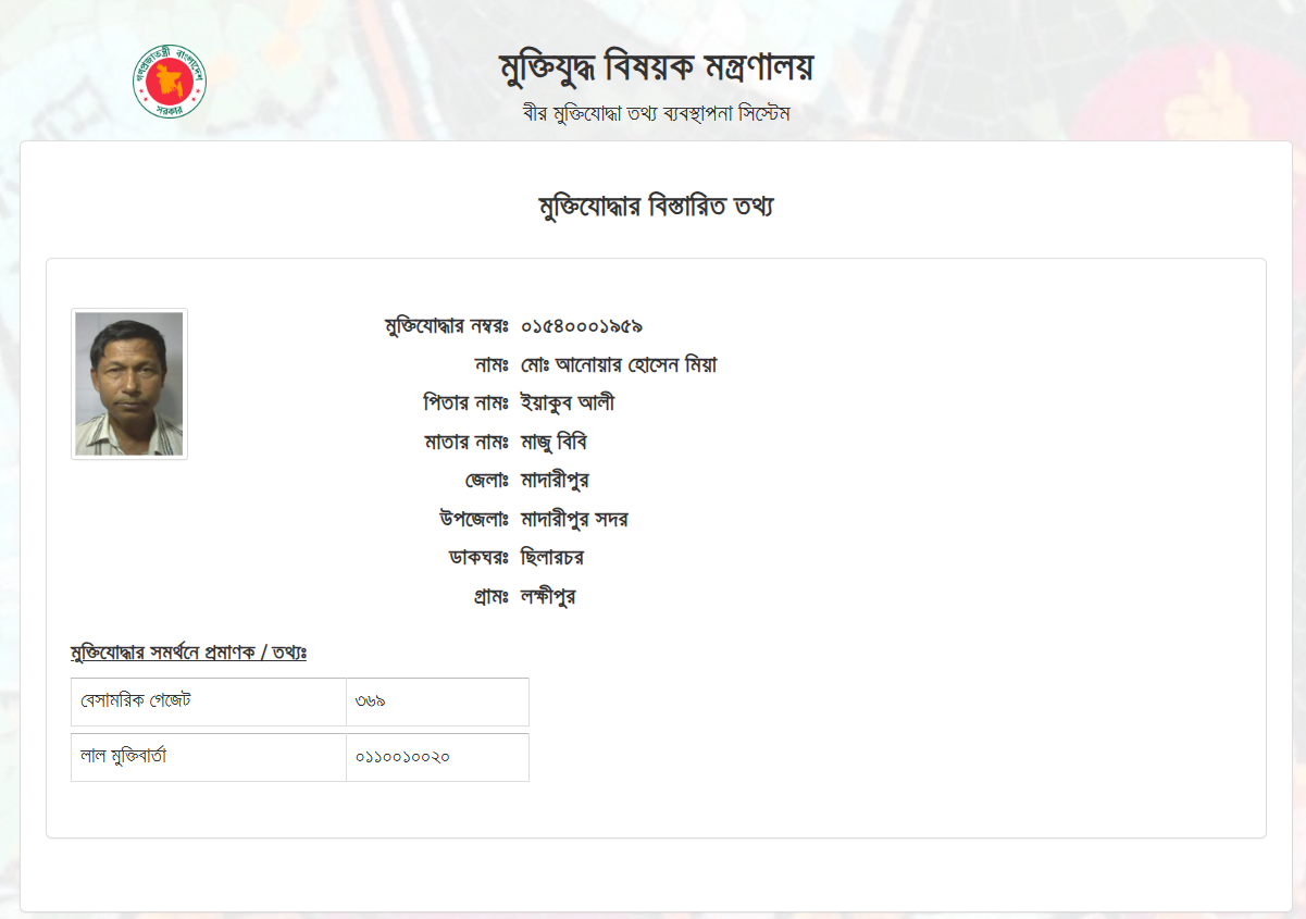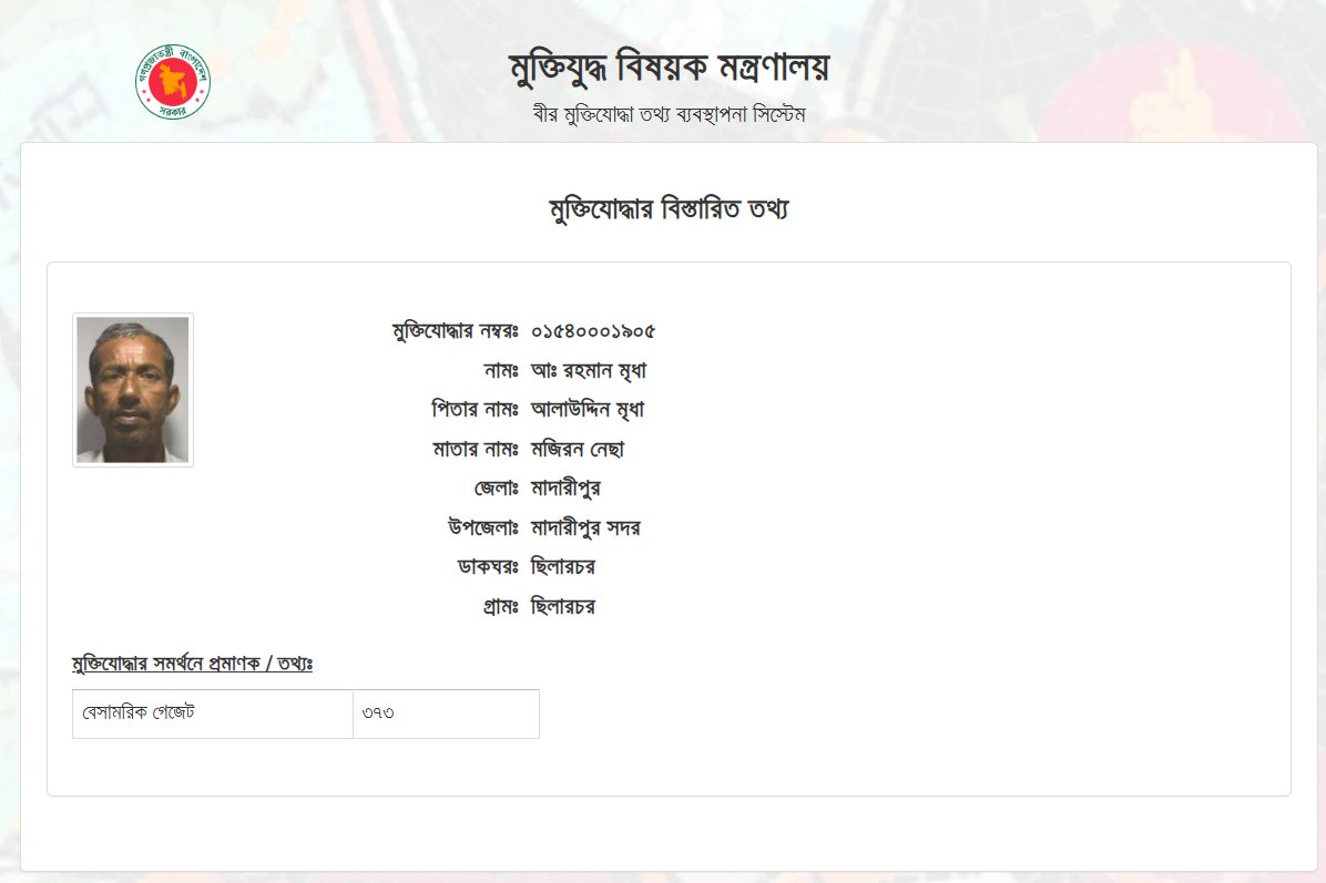 | ৫ | এ মোতালেব | যুদ্ধাহত গেজেট ৩৯৬ | | 0 | ছিলারচর | | | দেখুন |